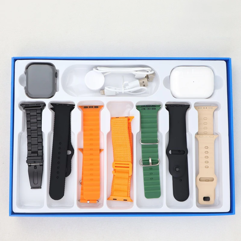 ساعت هوشمند طرح اپل واچ مدل ws-83 max دارای هفت بند با تنوع با رنگ های مختلف و جذاب است که یکی از بندهای آن فلزی طرح رولکسی میباشد.این ساعت یک ایرپاد هدیه نیز به همراه خود دارد.ساعت WS-83 MAX با سایز ۴۵ میلیمتر، دارای صفحه منوی سریع و روان لمسی با قابلیت نمایش اعلان ها و نوتیفیکیشن ها است.برخی از قابلیت های این ساعت به شرح زیر است: دارای شارژر وایرلس پرسرعت، قابلیت مکالمه و برقراری تماس ها،بند قفل دار، دارای شاتر دوربین گوشی،سازگار با بلوتوث ۵ ،سنسورهای ضربان قلب، فشار خون،اکسیژن خون و پایش خواب، گام شمار، کالری شمار، استاندارد ip68( مقاوم در برابر پاشش آب)، پشتیبانی از تغییر واچ فیس ها،قابلیت کنترل موسیقی، ماشین حساب، تقویم،یادآورها، نمایش وضعیت آب و هوا،باتری با طول عمر بالا. داشتن هفت بند با رنگهای متنوع و زیبا در کنار این قابلیت ها ،این ساعت را به عنوان یک ساعت هوشمند جذاب و کاربردی در میان ساعت های هوشمند میان رده قرارداده است